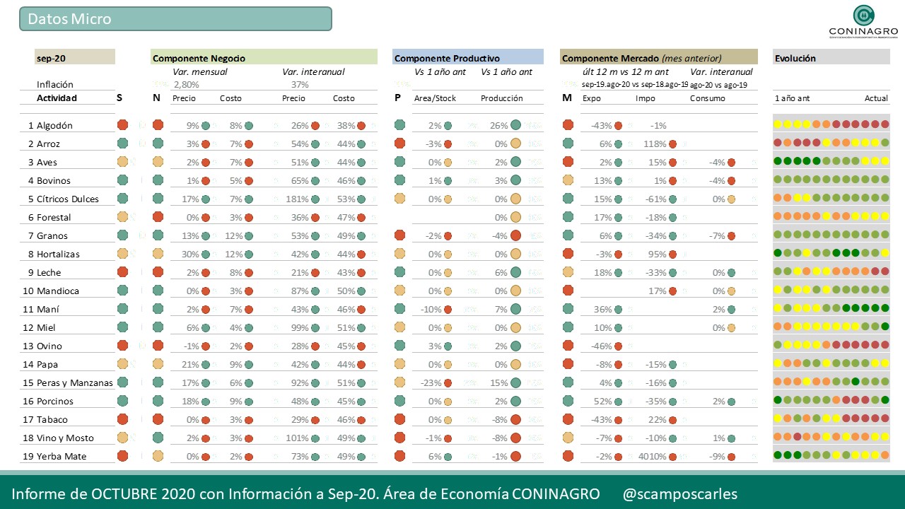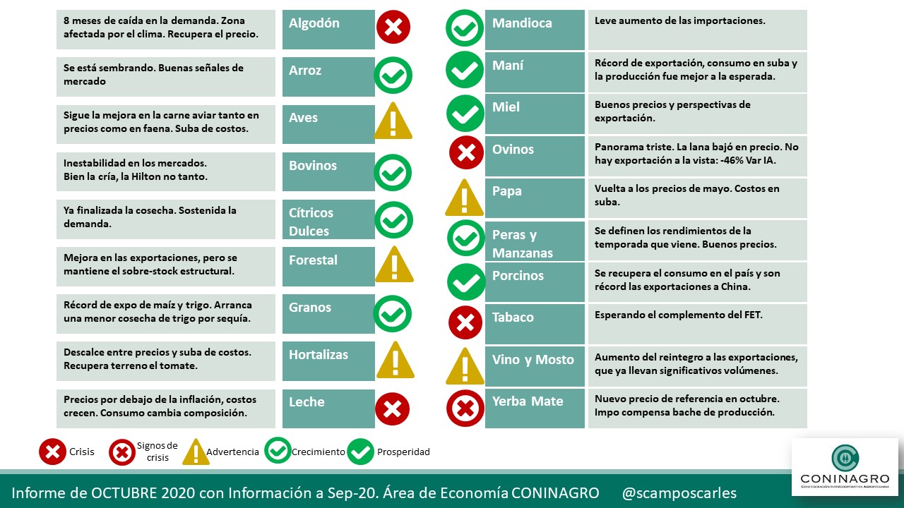 Como todos los meses, Coninagro publica esta herramienta para que el productor agropecuario pueda hacer un seguimiento de los indicadores que se analizan. Mirá en detalle el relevamiento de las 19 economías regionales monitoreadas por el área de Economía de CONINAGRO, con cifras que surgen del análisis realizado durante el mes de septiembre de 2020. El “Semáforo de Economías Regionales” busca simplificar la complejidad y heterogeneidad de la producción en el campo hacia una herramienta visual de análisis.