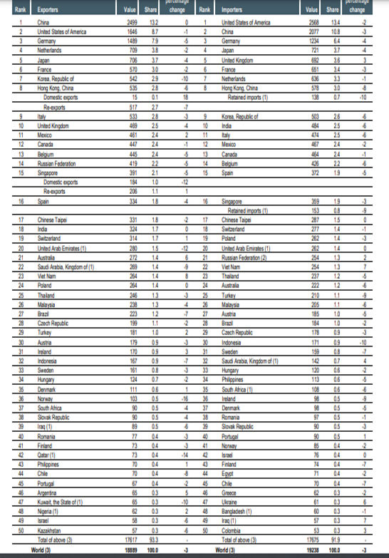 En sintonía con el escenario internacional, el siguiente listado (de la OMC) muestra los mayores exportadores mundiales en la última lista anual confeccionada a la fecha. Son 50 países que generan 93,3% del total de exportaciones mundiales: