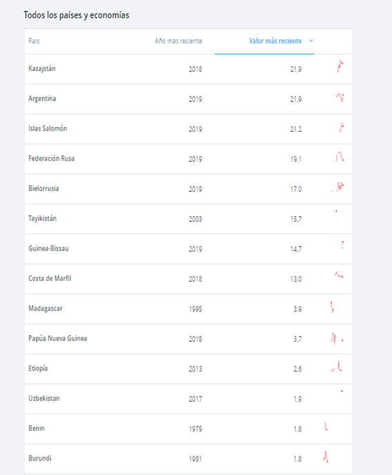 Como se observa, Argentina comparte el nivel de país que más grava impuestos a las exportaciones en relación a la recaudación total del país, comparado con cualquier otro en el mundo. Y a la vez se advierte al comparar que la lista de países que gravan con exportaciones de modo significativo, es una lista en la que no aparecen los países o las economías más virtuosas del mundo.