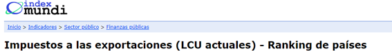 Los impuestos a las exportaciones, como carga de cierta relevancia sobre la producción y para los ingresos fiscales, son tributos aplicados por muy pocos países y a la vez por países de escaso desarrollo económico o, en su caso, de escasa virtud en materia de organización productiva.