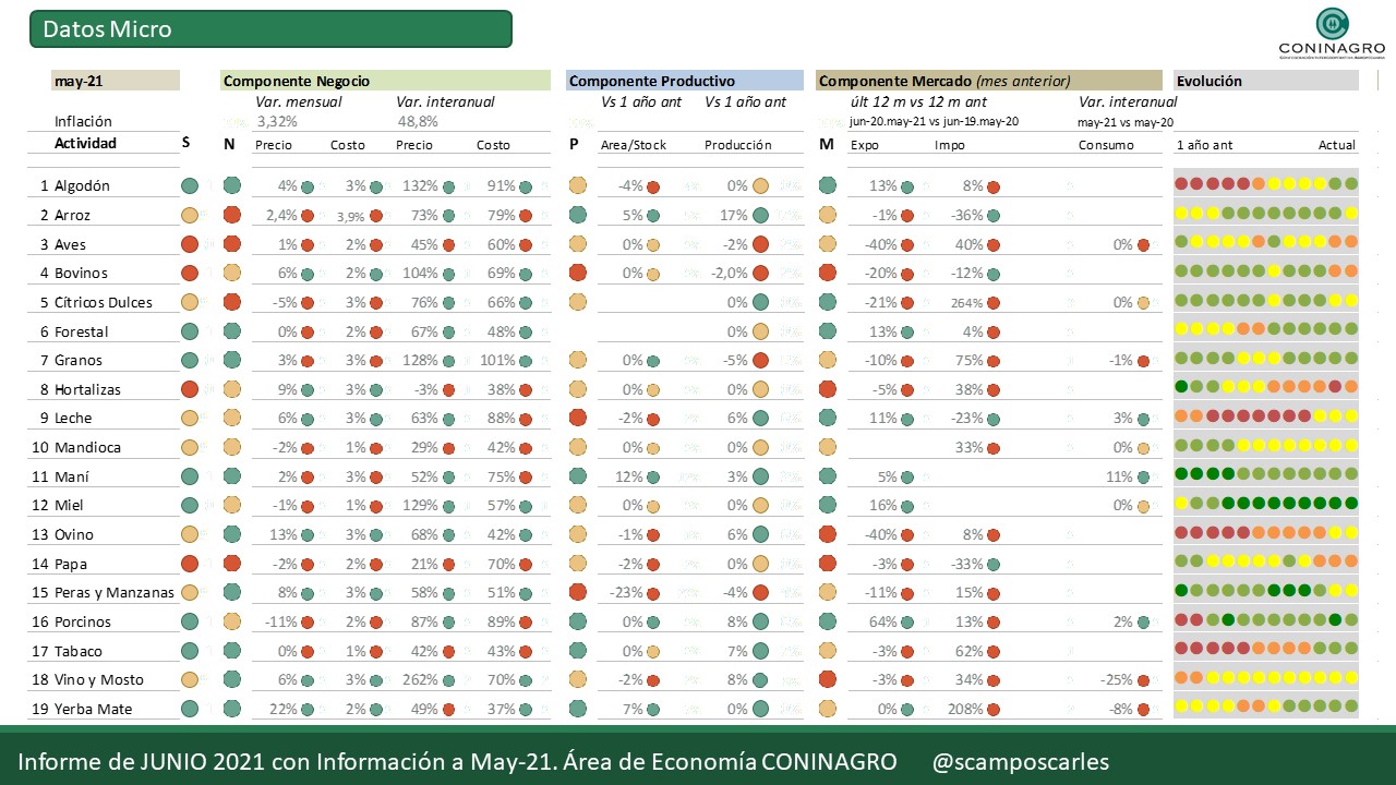 Coninagro publica esta herramienta para que el productor agropecuario pueda hacer un seguimiento de los indicadores que se analizan. Mirá en detalle el relevamiento de las 19 economías regionales monitoreadas por el área de Economía de CONINAGRO, con cifras que surgen del análisis realizado durante el mes de mayo de 2021. El “Semáforo de Economías Regionales” busca simplificar la complejidad y heterogeneidad de la producción en el campo hacia una herramienta visual de análisis.