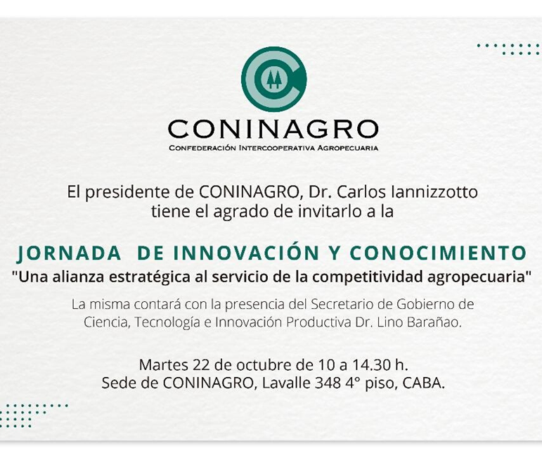 Con la finalidad de seguir trabajando junto a las diversas universidades del país, el próximo martes 22 de octubre se realizará en nuestra sede la Jornada «Innovación y conocimiento. Una alianza estratégica al servicio de la competitividad agropecuaria» con representantes de universidades de todo el país. La jornada contará con la presencia del Secretario de Gobierno, Ciencia, Tecnología e Innovación Productiva Dr. Lino Barañao, junto a representantes de diversas universidades del país y referentes de nuestras CARES. Más información Santiago Sancho