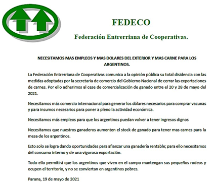 Nota de FEDECO sobre el cierre de exportación de carnes