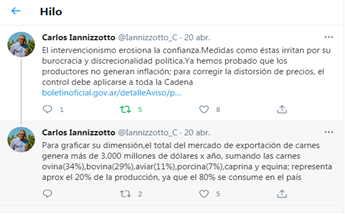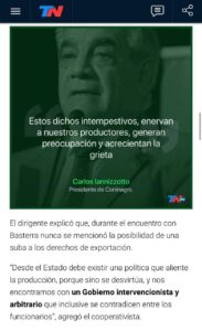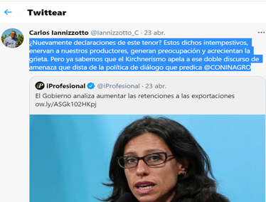 «¿Nuevamente declaraciones de este tenor? Estos dichos intempestivos, enervan a nuestros productores, generan preocupación y acrecientan la grieta. Pero ya sabemos que el Kirchnerismo apela a ese doble discurso de amenaza que dista de la política de diálogo que predica @CONINAGRO«, escribió el titular de la entidad en su cuenta de Twitter.