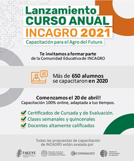 El programa del Curso Anual INCAGRO 2021 cuenta con módulos correlativos al ciclo 2020 y 2019 y amplía temáticas referidas a las herramientas digitales de gestión empresaria, buenas prácticas agropecuarias, mercado climático, Sistema Stop, liquidación de sueldos y jornales, y desafíos para la producción y comercialización de granos de la Argentina.