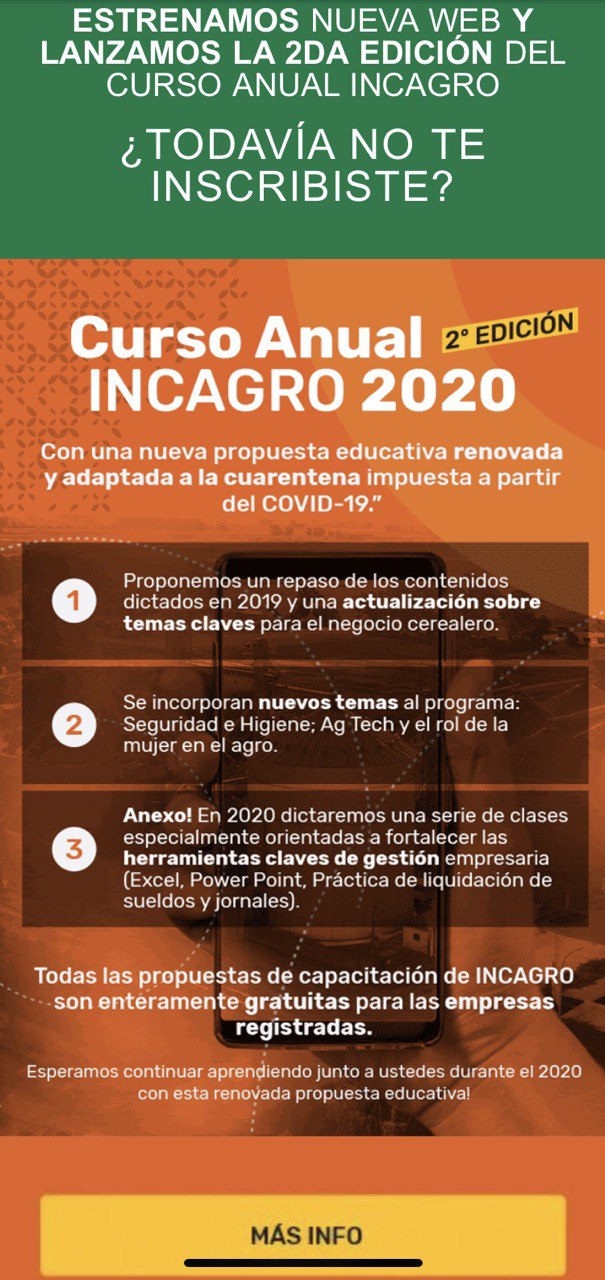 El Instituto de Capacitación Agropecuaria, presenta el Curso Anual 2020 que se realizará en forma grabada, en cumplimiento con el aislamiento por COVID-19, pero con interacción permanente con el docente. Con un ampliado temario de cursos y docentes especializados en cada materia, especialmente enfocado en el manejo de las herramientas de uso diario de las empresas del sector. Las propuestas de capacitación de INCAGRO son exclusivas para las empresas registradas en el Instituto, es decir aquellas firmas que contengan empleados de comercio, rama cerealera.