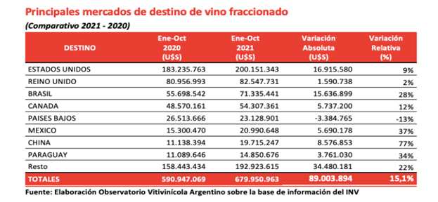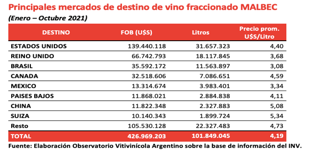 Si bien en la información desagregada por mercados (provista por el Observatorio Vitivinícola Argentino ) los datos anuales de 2021 aún no están completos, los referidos a los 10 meses transcurridos entre enero y octubre de 2021 muestran la relevancia por mercados (de esta información puede hacerse ya una proyección anual) siguiente, en primer lugar en relación con el vino fraccionado en general y en segundo específicamente a vino Malbec, el de mayor éxito comercial: