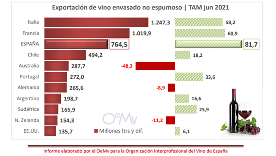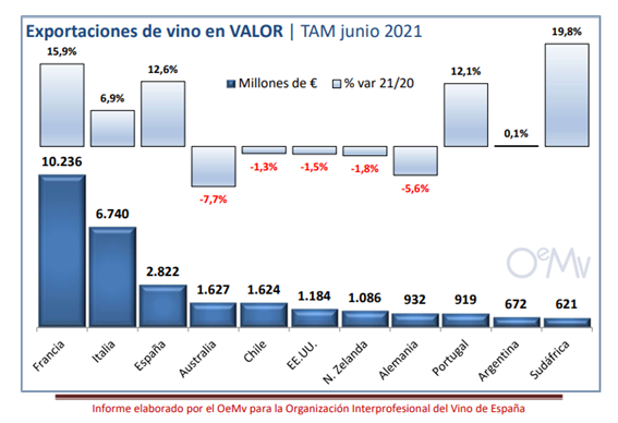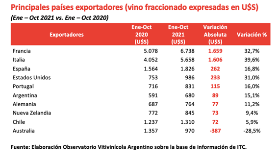 Según el Observatorio Español del Mercado del Vino (que es una fuente de referencia mundial para el análisis internacional, y que analiza los mercados globales en esta industria) Argentina, con datos aun hasta el primer semestre de 2021, está entre los 10 principales exportadores mundiales en vino de todos los tipos: