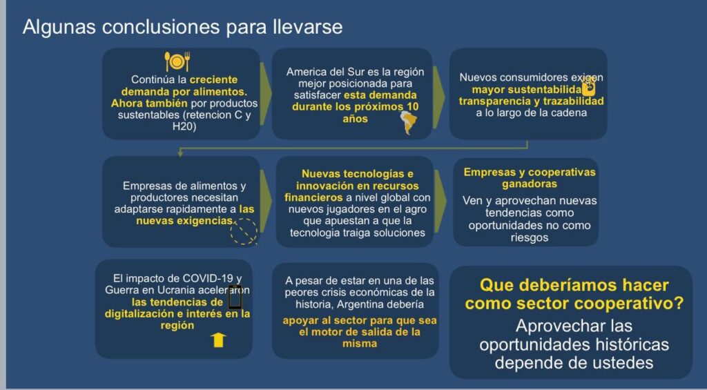 Entre los temas abordados por Gobbée, se expuso qué tendencias se prevén en relación a la alimentación a nivel global y qué nuevas tecnologías deben incorporar los sectores de las cadenas de valor para ser más competitivos. Además, se mencionaron dos grandes aspectos vinculados a la producción de alimentos; un modelo donde se procura producir cantidad a bajo costo, y otro modelo que supone trazabilidad y variantes de producción sustentable ambientalmente, y se evaluó la complementariedad de ambos y el rol del productor cooperativo en ese sentido. En tanto, se debatió sobre estudios que estiman que a lo largo de toda la cadena desde producción, comercialización, incluso hasta en los polos gastronómicos, hay un 30% de alimentos que se terminan desechando, entre otros temas de interés e impacto para el sector.