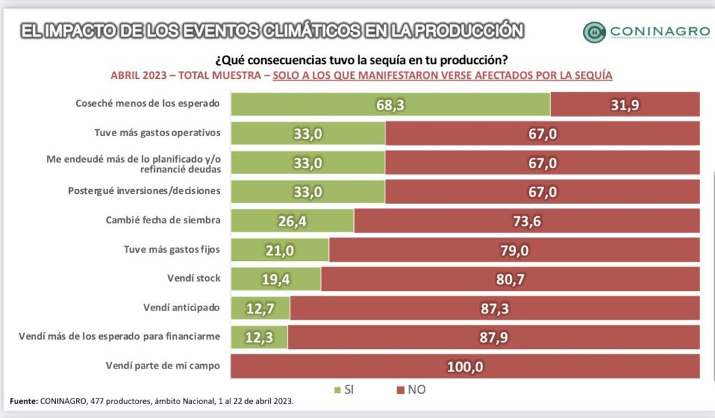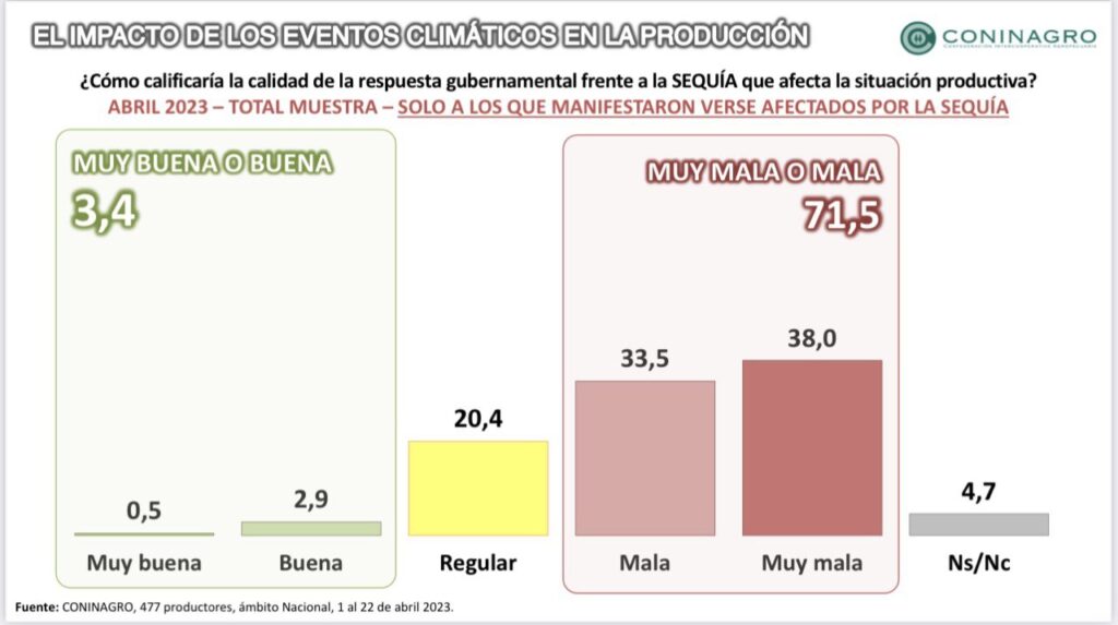 Cuando la base encuestada fue consultada sobre qué consecuencias tuvo la sequía en su producción, el 68,3 % confesó que “coseché menos de lo esperado”, mientras que el 33% tuvo “más gastos operativos”, o se endeudó o postergó “inversiones/decisiones”. En tanto, el 38% aseveró que su producción se redujo menos de un 50%, mientas que un 45% de los encuestados indicó que su producción se redujo un 60% o más. Finalmente, el 71,5% de los productores agropecuarios de Coninagro calificó a la respuesta gubernamental frente a la sequía como “mala o muy mala”.