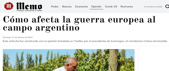 “Repruebo la posición neutral que tomó la Argentina. Es un desatino que el Gobierno no haya condenado el avance y las maniobras de Putin. Esto evidencia falta de liderazgo y de políticas de Estado. Mi enérgico rechazo a la atrocidad de la guerra. Además expresó públicamente mi preocupación por la situación desatada en el Este europeo. El impacto en el mundo es muy fuerte y este complejo escenario exige seriedad, pero nuestra política exterior está fuera de foco ante esta descabellada necedad que está viviendo el mundo. Destaco dos ejes generales de impacto sobre Argentina: 1°: identificamos un alza imprevista en los precios y en la demanda de los commodities agrícolas, que no necesariamente haya venido para quedarse. Rusia y Ucrania son relevantes exportadores de trigo y girasol. Una situación anormal en sus territorios afecta el aprovisionamiento internacional y hace subir precios. Eso favorece temporalmente agroexportaciones Arg. Aunque podría hacer volver cierta tensión interna en nuestro país si el gobierno quiere interferir en los precios internos.”