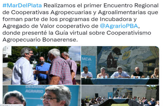 Se realizó en Mar Del Plata el primer Encuentro Regional de Cooperativas Agropecuarias y Agroalimentarias que forman parte de los programas de Incubadora y Agregado de Valor cooperativo donde se presentó la Guía virtual sobre Cooperativismo Agropecuario Bonaerense. Participaron Raúl González, Paulo Ares y Mario Raiteri en representación de Coninagro.
