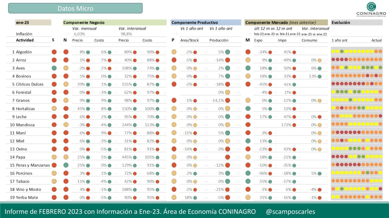 Coninagro publica esta herramienta para que el productor agropecuario pueda hacer un seguimiento de los indicadores que se analizan. Mirá en detalle el relevamiento de las 19 economías regionales monitoreadas por el área de Economía de CONINAGRO, con cifras que surgen del análisis realizado durante el mes de enero de 2023. El “Semáforo de Economías Regionales” busca simplificar la complejidad y heterogeneidad de la producción en el campo hacia una herramienta visual de análisis.