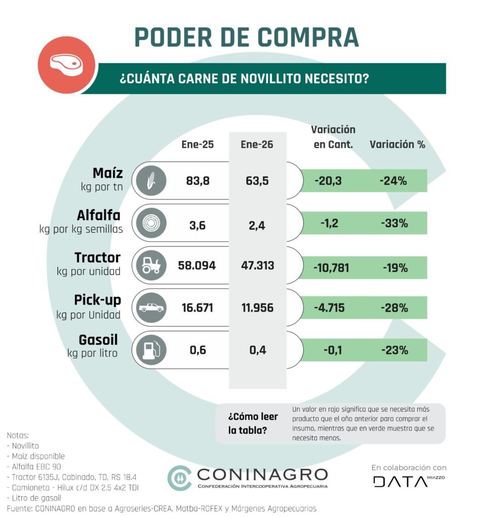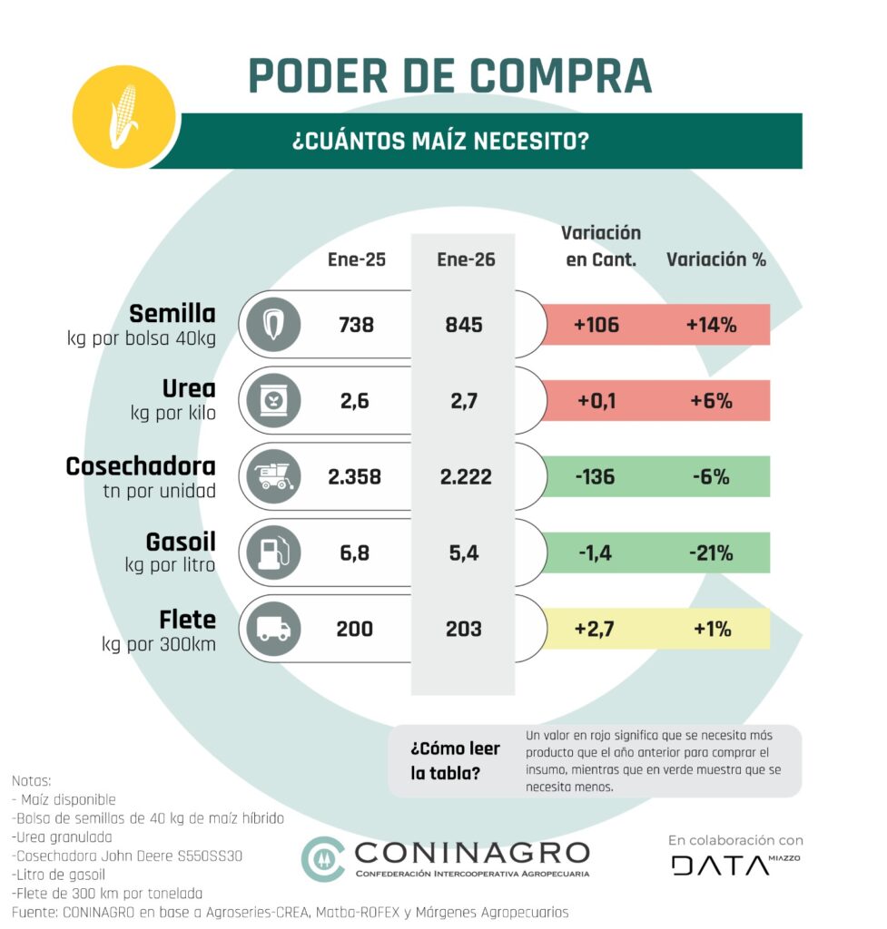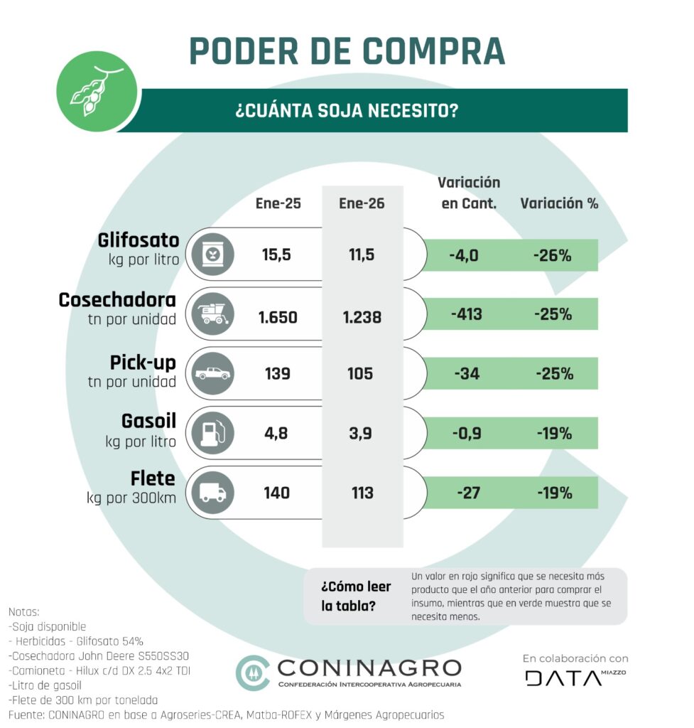 La baja de los precios del trigo deterioró su poder de compra frente a los principales costos de producción y logística. Los insumos (Respecto a la UREA el trigo perdió 10% interanual) y el transporte (frente al gasoil cayó 5% interanual) continúan absorbiendo una mayor proporción del valor del cereal, mientras que, si bien los bienes de capital muestran una leve mejora en el corto plazo (-3%), en una perspectiva de mediano plazo el deterioro del poder adquisitivo del trigo sigue siendo significativo (+35%).