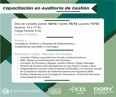Luego de tres jornadas de trabajo finalizó la capacitación en auditoria que organizó el área de administración de CONINAGRO junto a Fundación Sancor Seguros, ICES y la Confederación Alemana de Cooperativas.