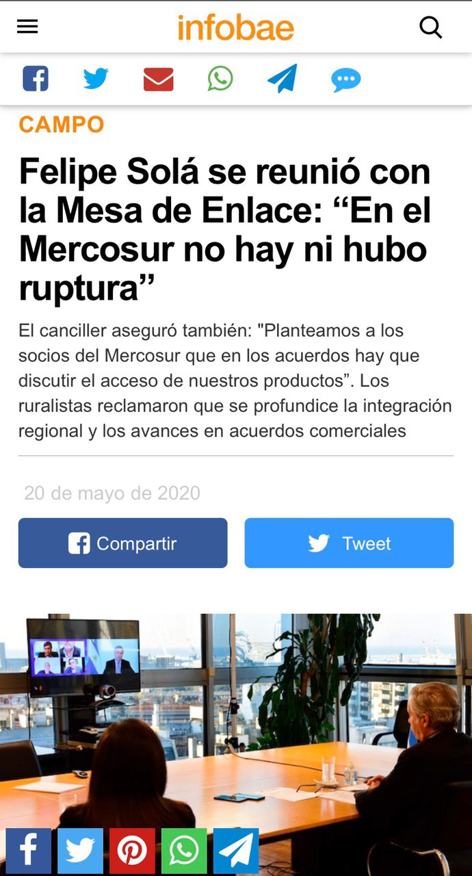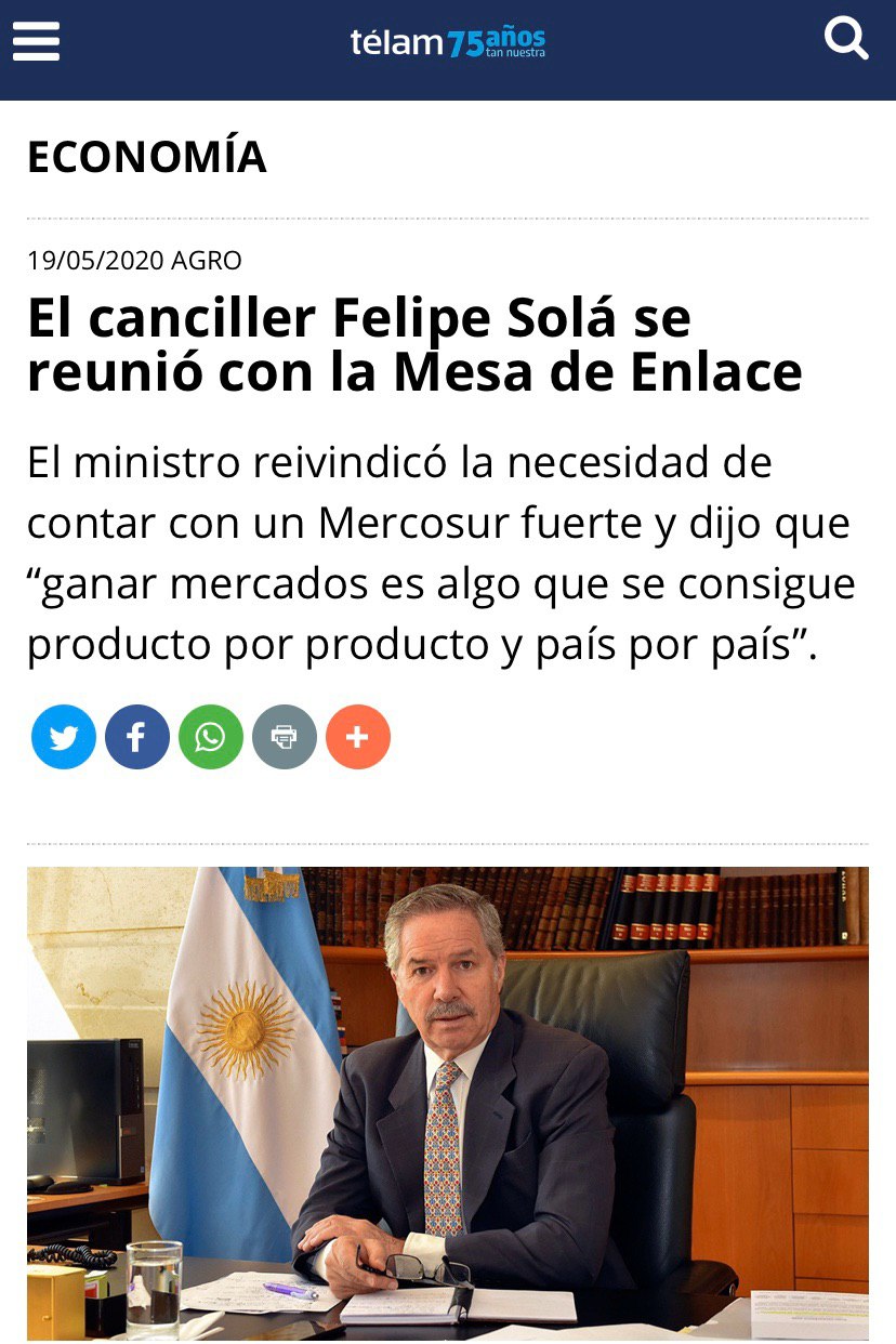 La Comisión de Enlace de Entidades Agropecuarias mantuvo una reunión virtual con el Ministro de Relaciones Exteriores, Comercio Internacional y Culto, Ing. Felipe Solá. El propósito del encuentro fue interiorizarse acerca de lineamientos generales de política exterior que está llevando adelante la Cancillería, con relación al sector agroindustrial. Ver nota completa aquí