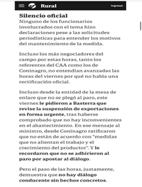 Continental – Daniel Kindebaluc, Secretario general del CONINAGRO: «Fue una discusión muy debatida, el resultado fue un rechazo a la medida. El no acompañamiento no quiere decir que hay algo de positivo en esa medida. La cuestión era que nos parecía que faltaba una cuota de gestión para lograr buenos resultados, se sigue trabajando con el ministerio para que se de marcha atrás con esta medida. Nosotros valoramos mucho la situación del país post covid, se balanceó todo eso y se resolvió no acompañar la medida de fuerza, pero de acuerdo con el reclamo».