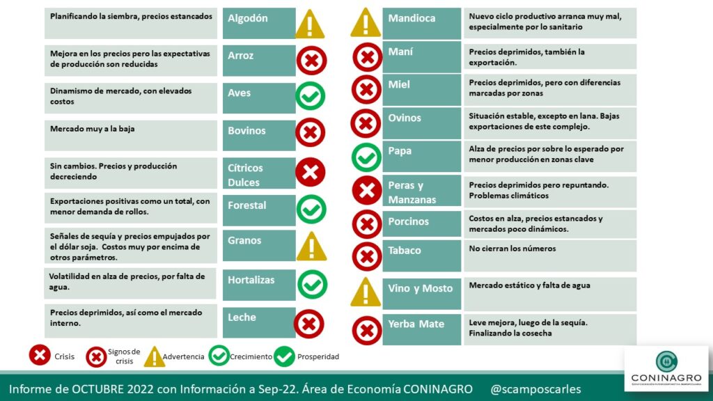 En ese contexto y de acuerdo con el semáforo de las producciones que elabora CONINAGRO, la lechería, la producción de arroz, de yerba mate, cítricos dulces más peras y manzanas, se ven afectadas de distinta manera por las ya mencionadas situaciones.