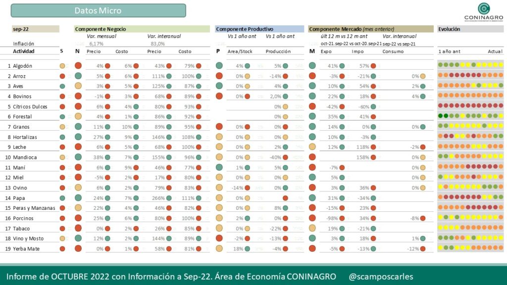 CONINAGRO publica esta herramienta para que el productor agropecuario pueda hacer un seguimiento de los indicadores que se analizan. Así están las 19 economías regionales monitoreadas por el área de Economía de CONINAGRO, con cifras que corresponden al mes de septiembre del análisis realizado durante el mes de octubre de 2022. El “Semáforo de Economías Regionales” busca simplificar la complejidad y heterogeneidad de la producción en el campo hacia una herramienta visual de análisis.