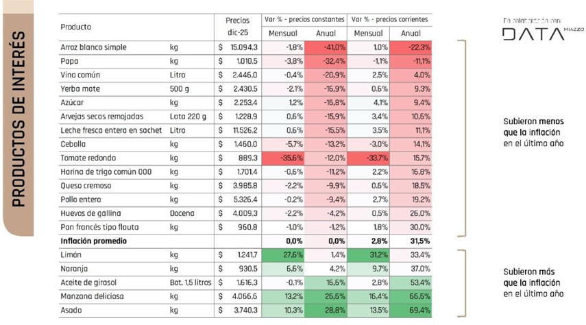 El impacto se observa con mayor intensidad en productos como el arroz, vino y yerba mate, donde los costos han aumentado por encima de los precios, afectando la rentabilidad de los productores. Esta situación se replica en varias economías regionales que abastecen el mercado interno. Por poner algunos ejemplos: en el último año el arroz ha perdido el 43,6% de su valor real, la papa el 40,2% de su valor real y la cebolla 25%.