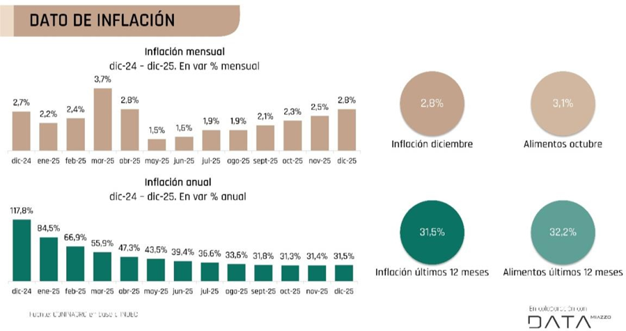 INDEC informó que la inflación del último mes del año fue del 2,8%, es el más alto registrado desde marzo de 2025, y muestra que la inflación continúa con la suba iniciada en junio de 2025 (luego de que en mayo se registrara un incremento del 1,5%, el más bajo en 5 años).