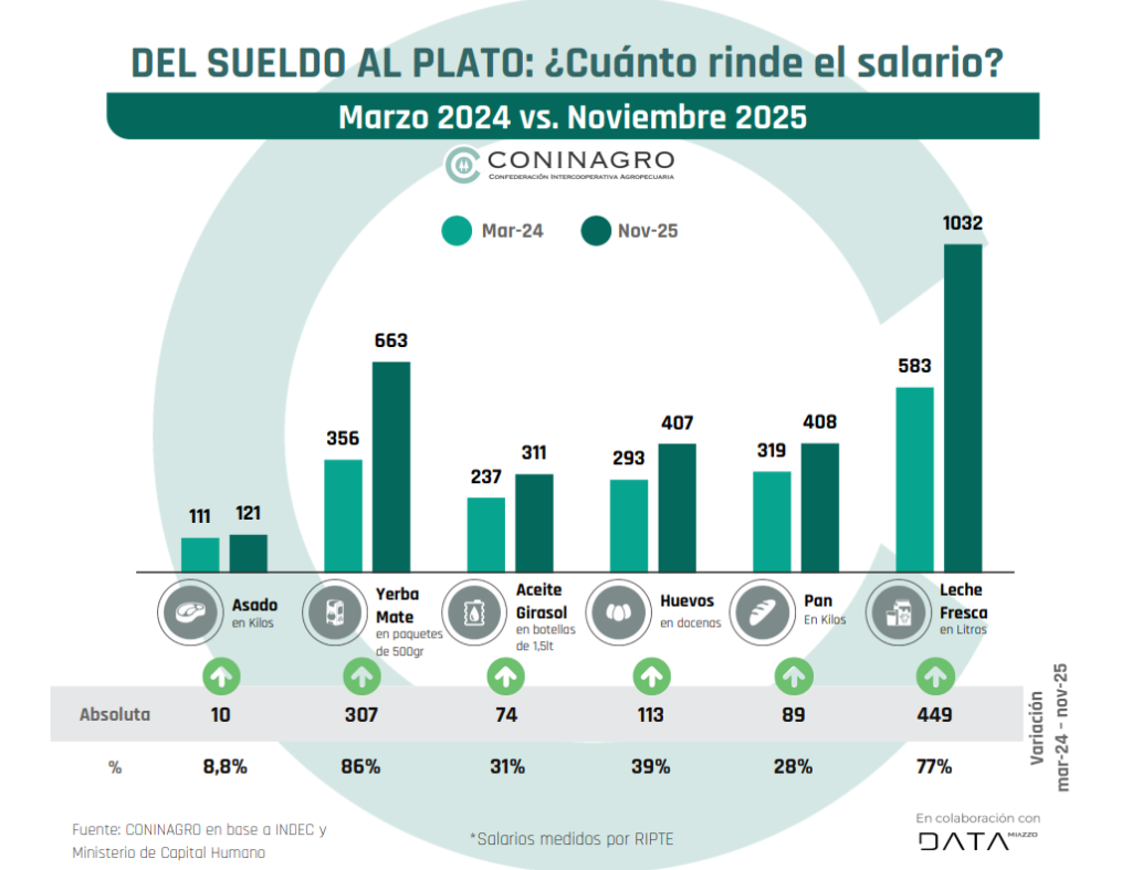 Entre marzo de 2024 y noviembre de 2025, el poder de compra mostró una mejora significativa frente a productos esenciales de la canasta básica: aceite de girasol, yerba mate, leche, asado, huevo y pan.