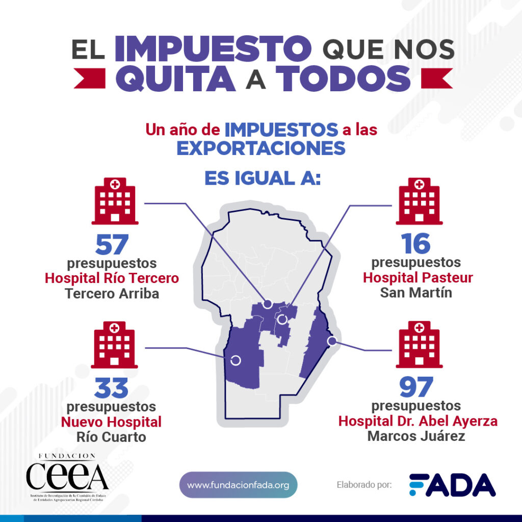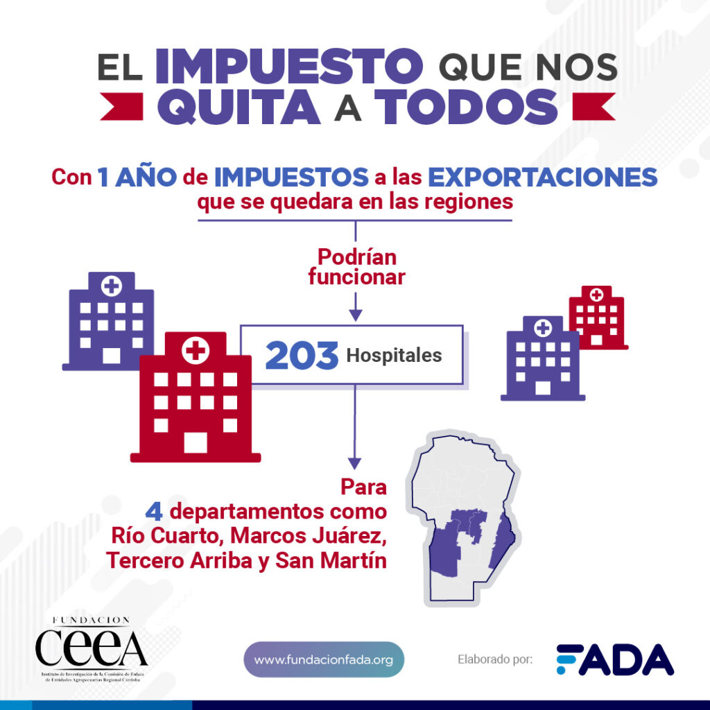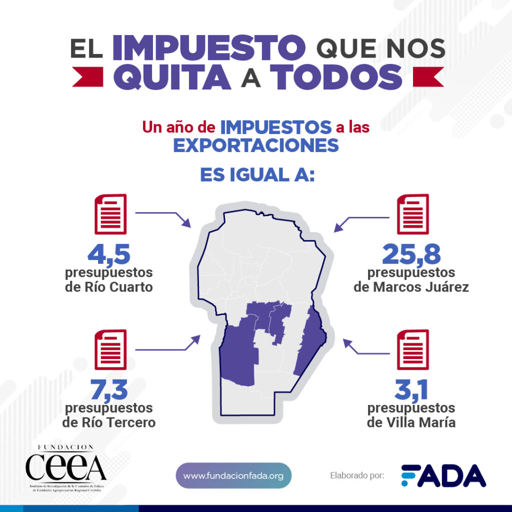 El informe demuestra lo que se va de las regiones y no vuelve. El estudio de Fundación Instituto de Investigación de la CEEA Regional Córdoba y de FADA (Fundación Agropecuaria para el Desarrollo de Argentina) muestra que con un año de impuestos a las exportaciones de una región se podrían generar inversiones que darían trabajo a 15.700 familias. Este dato medido en un caso testigo de cuatro departamentos de Córdoba, y que es aplicable a otras regiones del país, es decir que son pérdidas millonarias para muchas de nuestras ciudades y pueblos.