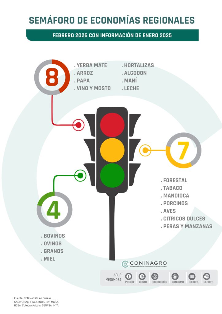 Durante enero de 2026, el Semáforo de Economías Regionales registró 4 actividades en verde, 7 en amarillo y 8 en rojo. En comparación con el mes anterior, se observó una desmejora, ya que la actividad lechera y manicera cambio de categoría de amarillo a rojo.