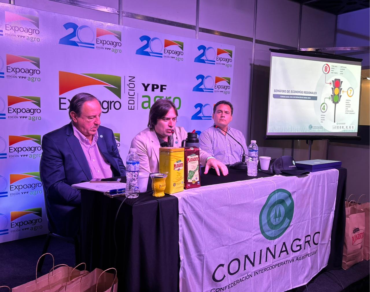 En el marco de una nueva edición de ExpoAgro 2026, el Presidente Lucas Magnano junto al Secretario Mario Raiteri, el Economista David Miazzo y el Ministro de Bioagroindustria de Córdoba Sergio Busso, Ministro de Desarollo Económico de Entre Ríos Guillermo Bernaudo, Ministro de Desarrollo Agrario de la Provincia de Buenos Aires Javier Rodríguez y Secretario de Agricultura y Ganadería del Ministerio de Desarrollo de Producción de la Provincia de Santa Fe Ignacio Mántaras; presentaron el Semáforo de las Economías Regionales ante los medios en el Auditorio de Prensa de la Expo.