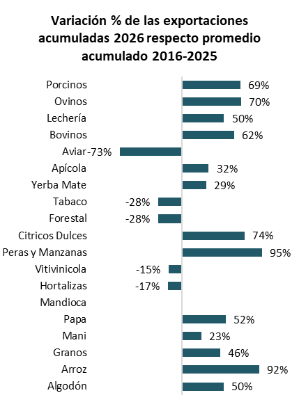 - Componente de negocio: En enero de 2026, los principales cítricos dulces registraron una caída mensual del 10% mensual, mientras que en la comparación interanual promediaron un incremento del 34%, ubicándose por encima de la inflación del período (32%).