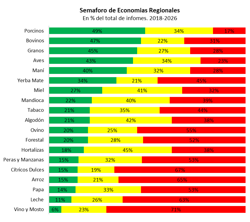 El semáforo de economías regionales se publica de manera mensual desde hace más de ocho años, lo que permite observar el desempeño de las distintas actividades en una perspectiva de largo plazo. En ese período, 8 de las 19 economías analizadas permanecieron en rojo durante más de la mitad del tiempo. Entre las situaciones más comprometidas se destacan la vitivinicultura y los cítricos dulces, que registraron indicadores en rojo en más del 70% de los meses. Les siguen la actividad citrícola, con el 67% de los meses en rojo, y la lechería, con el 65%.