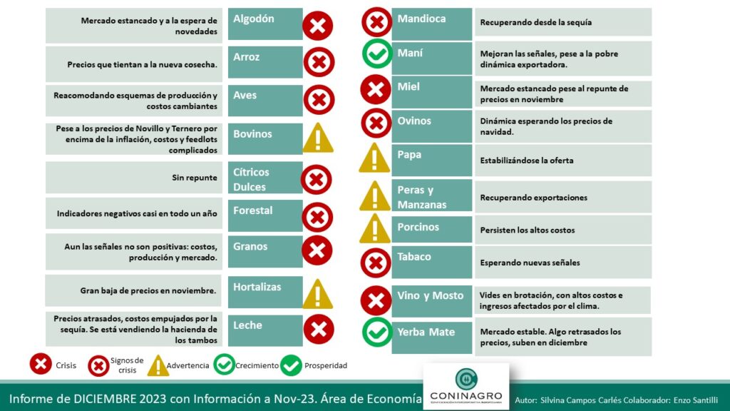 Coninagro publica esta herramienta para que los productores agropecuarios puedan hacer un seguimiento de los indicadores que se analizan. Mirá en detalle el relevamiento de las 19 economías regionales monitoreadas por el área de Economía de CONINAGRO, con cifras que surgen del análisis realizado durante el mes de noviembre de 2023. El “Semáforo de Economías Regionales” busca simplificar la complejidad y heterogeneidad de la producción en el campo hacia una herramienta visual de análisis.