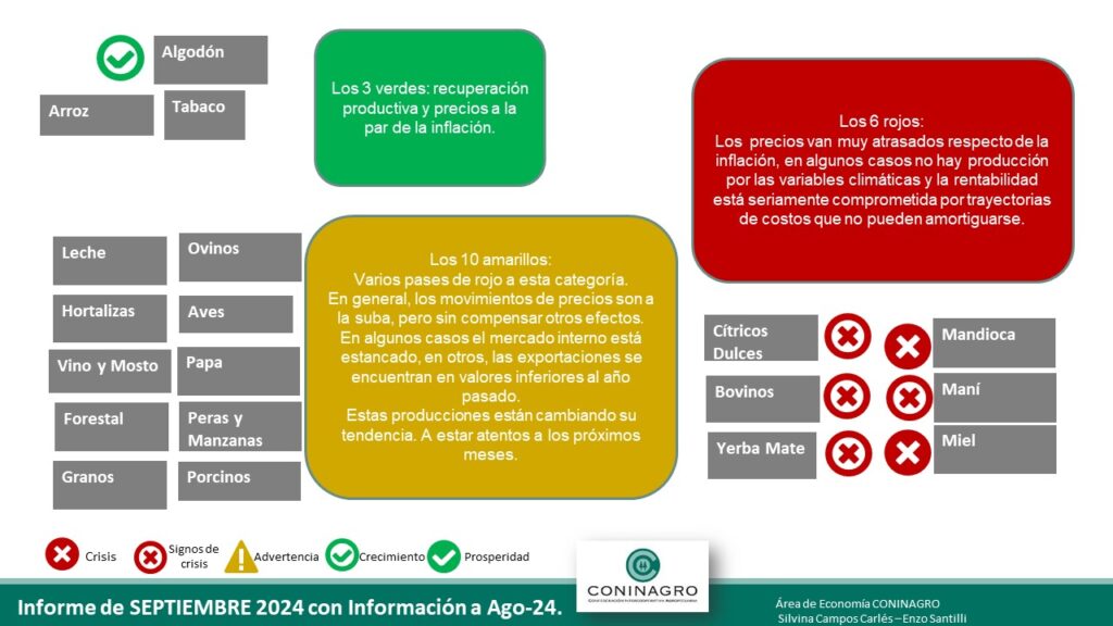 ● Y los rojos muestran precios muy atrasados respecto de la inflación, en algunos casos no hay producción por las variables climáticas y en otros, la rentabilidad está seriamente comprometida por trayectorias de costos que no pueden amortiguarse.