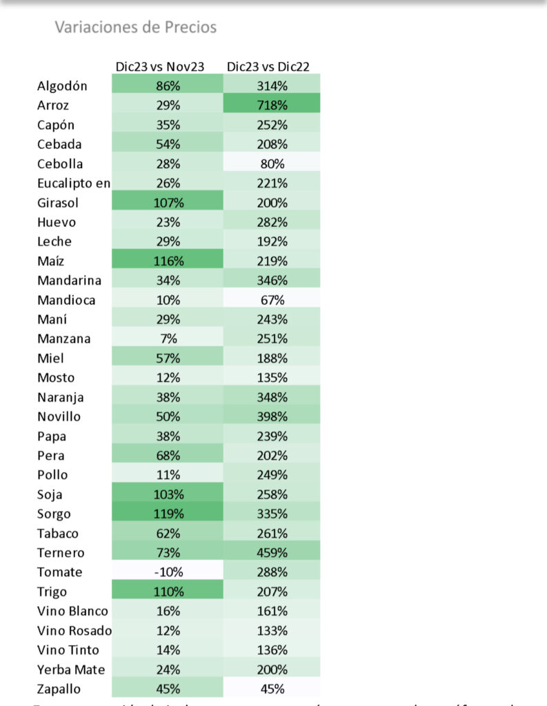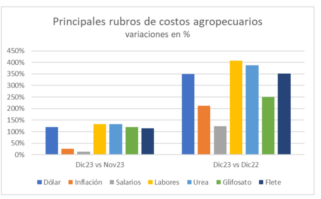 La contracara de los precios, los costos promedios de las 19 actividades crecieron interanualmente +250% en diciembre de 2023, con un máximo de +334% en el caso de arroz con pozos de gasoil (zona Entre Ríos).  Las variaciones mensuales e interanuales de los principales rubros se muestran en el siguiente cuadro: