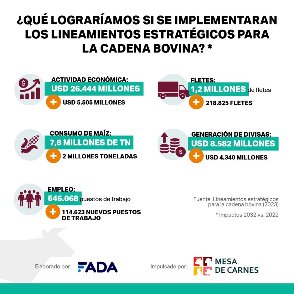 Desde la Mesa de Carnes, una organización conformada por una gran parte de las instituciones relacionadas a la producción de carnes de vaca, cerdo y pollos, se realizó un detallado informe con propuestas y estrategias para potenciar la actividad. El trabajo propone lineamientos con metas para 2032 que incluyen la generación de más 114 mil puestos de trabajo, un aumento de la producción de más de 1 millón de toneladas, ingreso por exportación por encima de los 4.000 millones de dólares y un aumento en la actividad económica de más de 5.000 millones de dólares. “A eso hay que sumarle más de 200 mil fletes para trasladar esa producción y más de 2 millones de toneladas adicionales de maíz para consumo animal. Es un derrame en todo el sector y sus alrededores”, afirman desde la Mesa de Carnes.