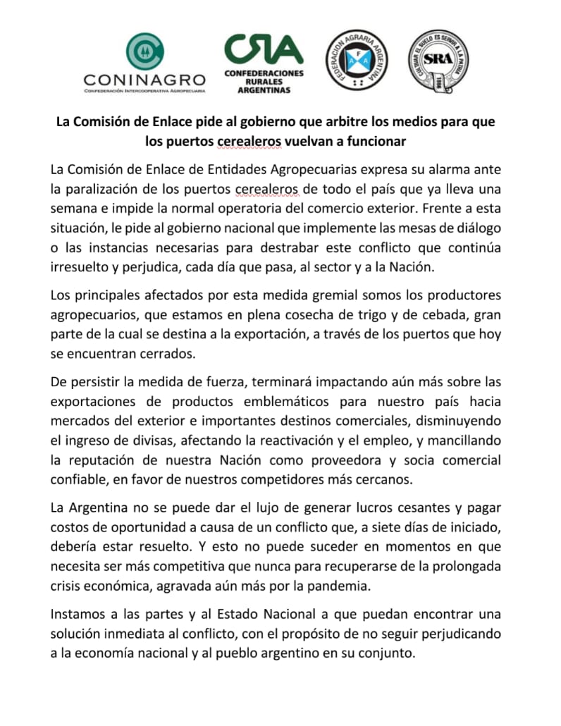 La Comisión de Enlace de Entidades Agropecuarias emitió un comunicado oficial