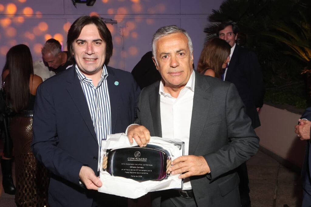 Luego por la noche, parte del Comité de Coninagro participó del encuentro de SANCOR en el cual se entregó una placa al Gobernador de Mendoza, Alfredo Cornejo, por los «90 años de la VENDIMIA EN MENDOZA».