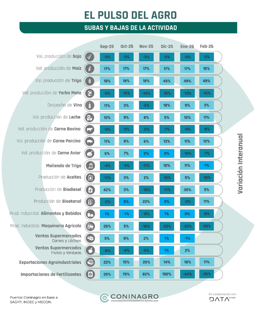 Al analizar la evolución de las actividades en números índice, tomando como base febrero de 2023, se observa una mejora general del agro, aunque con desempeños heterogéneos. Los cultivos extensivos, con el trigo a la cabeza y las exportaciones actúan como los principales motores de la economía rural. En contraste, la industria y los sectores más dependientes del consumo interno muestran una trayectoria de mayor estabilidad o amesetamiento, sin lograr despegar de los niveles de hace tres años.