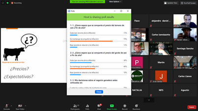 Luego, se realizó una encuesta a los participantes dirigida por Milagros Sobredo de Globaltecnos SA donde mencionó que se observaba disparidad en las respuestas, consecuencia del momento que estamos transitando. La mayoría de la sala de Córdoba estimó que el ternero va a acompañar la inflación. En el gordo las respuestas estuvieron un poco más divididas. En las respuestas, asimismo, también se observó que están viendo una oportunidad para crecer en ganadería.