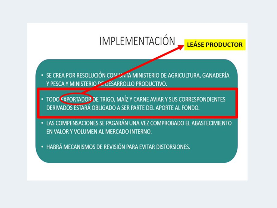 En cuanto al monto, se estima la demanda interna de trigo y maíz para consumo directo para el año 2022, se calcula el diferencial de precio interno a valores de noviembre 2021 y de enero 2022. Ese monto es 14.000 millones de pesos. Un contrasentido es que los fondos salen del valor de exportación de los productos de maíz, trigo y pollos. Es por ello que el mecanismo, al ser % de las exportaciones, tienen un efecto similar a los derechos de exportación.