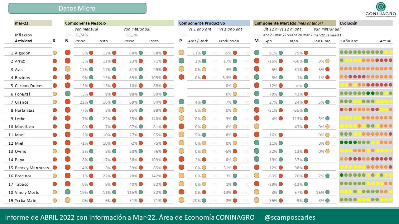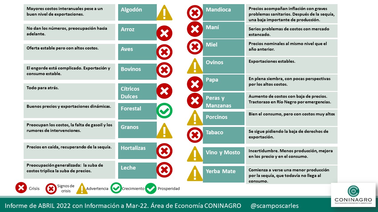 Coninagro publica esta herramienta para que el productor agropecuario pueda hacer un seguimiento de los indicadores que se analizan. Mirá en detalle el relevamiento de las 19 economías regionales monitoreadas por el área de Economía de CONINAGRO, con cifras que surgen del análisis realizado durante el mes de marzo de 2022. El “Semáforo de Economías Regionales” busca simplificar la complejidad y heterogeneidad de la producción en el campo hacia una herramienta visual de análisis.