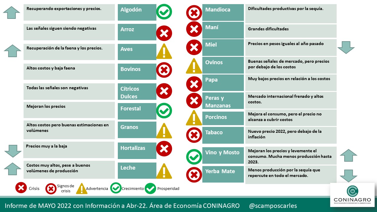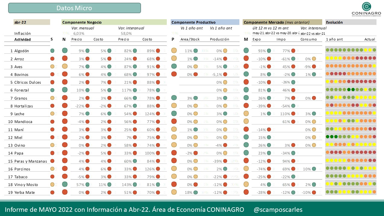 Coninagro publica esta herramienta para que el productor agropecuario pueda hacer un seguimiento de los indicadores que se analizan. Mirá en detalle el relevamiento de las 19 economías regionales monitoreadas por el área de Economía de CONINAGRO, con cifras que surgen de abril del análisis realizado durante el mes de mayo de 2022. El “Semáforo de Economías Regionales” busca simplificar la complejidad y heterogeneidad de la producción en el campo hacia una herramienta visual de análisis.