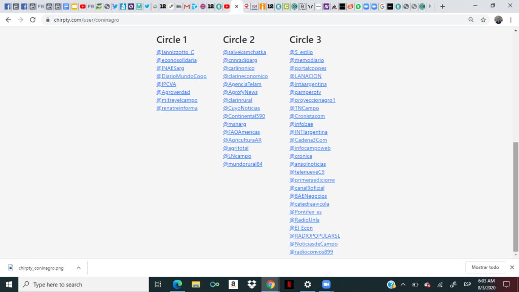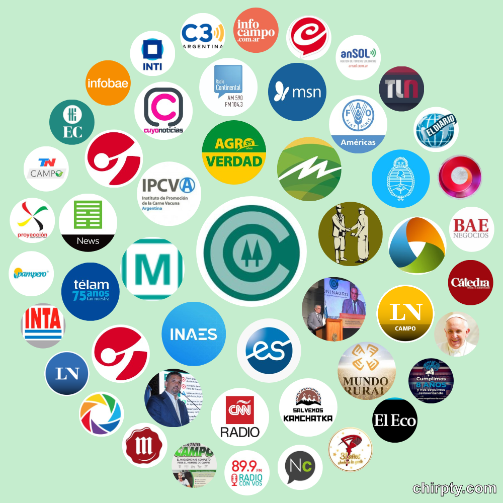 El área de Comunicación de Coninagro comparte Chirpty, una herramienta visual de fácil análisis para que interpreten y podamos ver qué cuentas y usuarios interactúan con mayor frecuencia con nuestra cuenta oficial de Twitter. ¿Cómo leerla? El usuario que la solicita aparece en el centro (en nuestro caso @Coninagro), mientras que alrededor se posicionan aquellas cuentas cercanas de interacción. Mientras más cercana esté la cuenta, más interacción se tiene con ella. Por dudas o inquietudes, consultar.