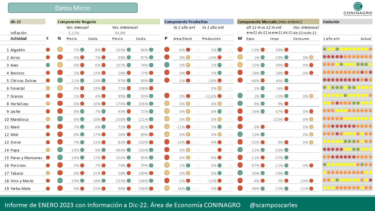 En tanto, desde el Área de Economía afirmaron que el estudio «muestra a la mayoría de las producciones en rojo, algunas en amarillo, y el principal factor entre el negocio, la esfera productiva y también el mercado, sigue siendo el aumento en los costos, con algunas recomposiciones de precios puntuales. La parte productiva y de mercado son las más afectadas. En la zona donde puede haber producción se levanta el precio pero por faltante, y en otras zonas está afectando la sequía, la reducción de superficies sembradas respectos a campañas anteriores», indicó la técnica Silvina Campos Carlés, a lo que agregó: «También se observan stocks disminuidos o no tan recuperados, excepto en ganadería que se espera un poco más de stock pero hacia adelante. En lo referido al mercado local, el consumidor no está validando subas en cantidades y en el plano internacional no se prevén subas importantes en valores».