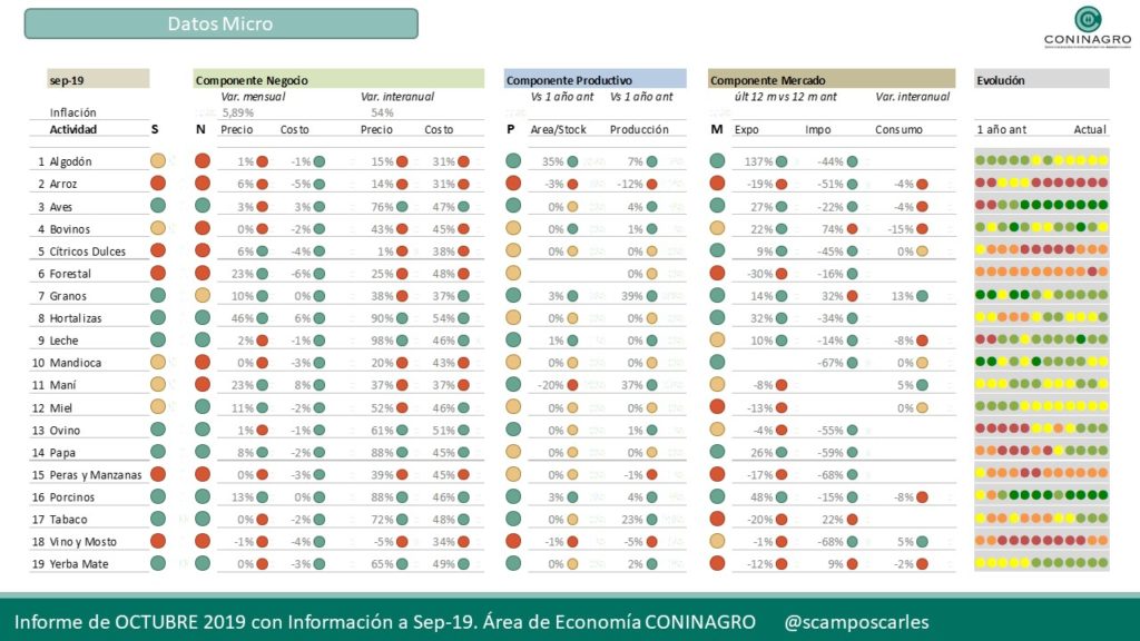 Como se observa en el cuadro, las economías que muestran prosperidad son las de industria porcina y de aves. En relación a la bonanza de la actividad porcina, está estrechamente ligada a que China aparece como nuevo horizonte de exportación. A su vez, muestran crecimiento los granos, hortalizas, el sector de lechería, ovinos, papa, tabaco y yerba mate. En otro orden, en una situación de «advertencia» o «estancamiento», se encuentran el algodón, los bovinos, la mandioca, el maní y la miel. En tanto, el arroz se enmarca en una situación de crisis, y en ese contexto aparecen también los cítricos dulces, el sector forestal, las economías de peras y manzanas y por último vino y mosto.