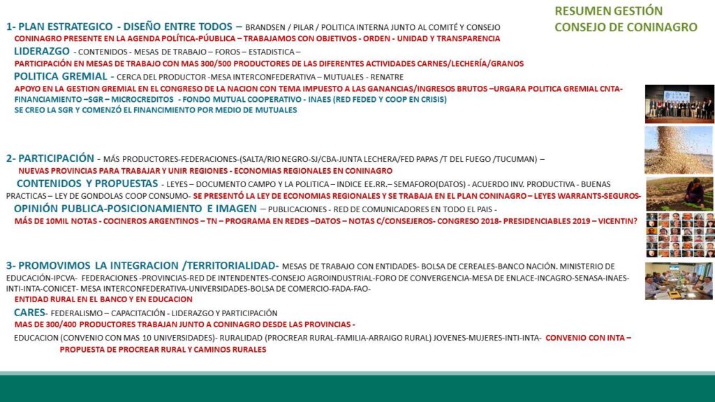 Por último, Coninagro promueve una GESTIÓN GREMIAL activa con Foros internos temáticos de lechería, granos, carne, ovino y apícola. Con una fuerte articulación público-privada con Inta, Renatre, Inaes, IPCVA, Senasa, Bco.Nacion y Bolsa de Cereales, y actividades sindicales laborales en CNTA, FAECYS y URGARA.